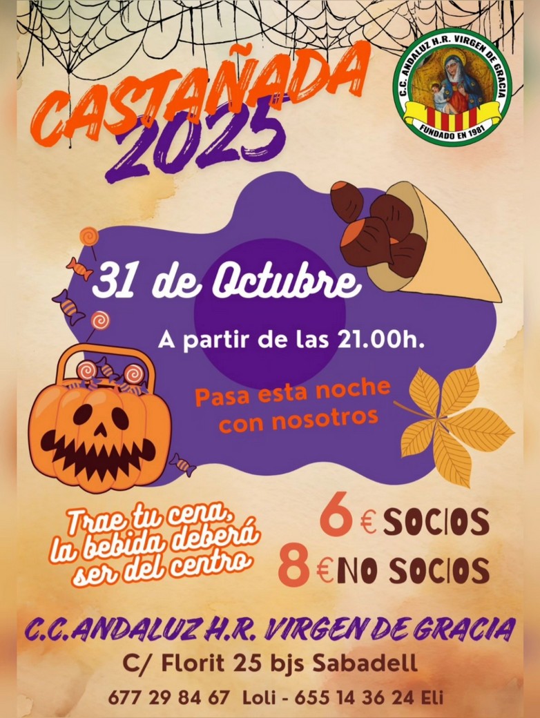 Os esperamos en la Castañada Centro Cultural Andaluza Hermandad Romera Virgen de Gracia30 Octubre 2025 Este próximo viernes, 31 de octubre, celebramos como cada año la Castañada. A partir de las 21 horas en nuestro local.