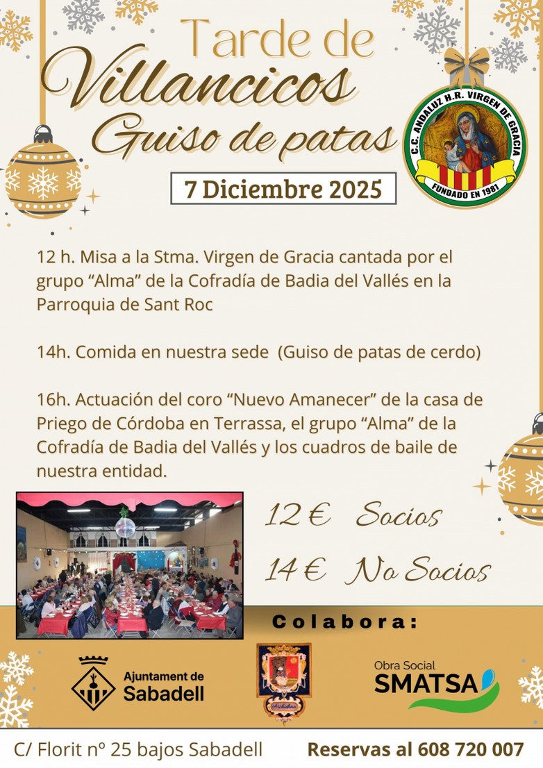 El Centro Cultural Andaluz Hermandad Rociera Virgen de Gracia en Sabadell celebra el próximo 7 de diciembre su tradicional tarde de villancicos en su sede (c/ Florit, 25). Los actos comenzarán a las 12 horas con una misa rociera cantada por el grupo Alma de la Cofradía de Badia del Vallès en la parroquia de Sant Roc, seguida de la comida de hermandad, el típico guiso de patas de cerdo que la entidad ofrecerá a todos los presentes. A las 16 horas comenzarán los villancicos, que serán interpretados por el grupo Alma de la Cofradía de Badia del Vallès y el coro Nuevo Amanecer de la Casa de Priego de Córdoba.